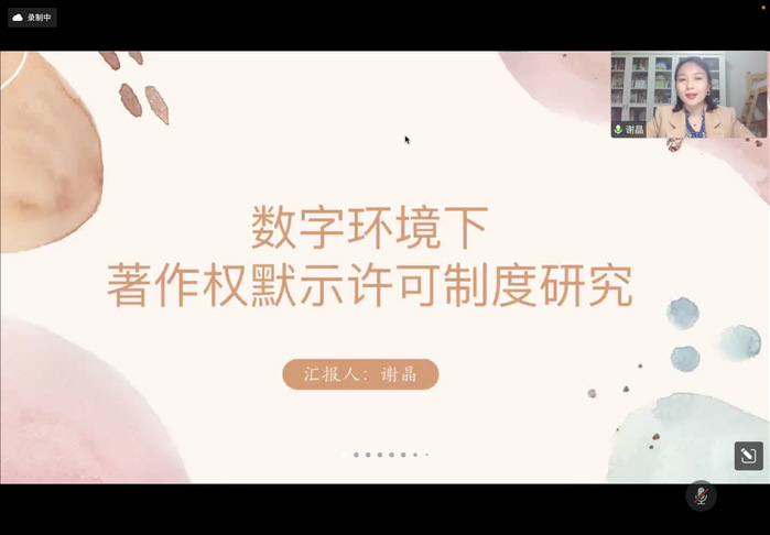 2022年11月14日晚,bat365官网平台“研究生学术月”青年博士论坛如期召开,青年博士谢晶以线上会议的形式,为全院同学作了一场题为《数字环境下著作权默示许可制度研究》的学术报告。本次报告由吴迪老师主持,李玉璧教授参与讨论,公司一百余名同学聆听了此次讲座。