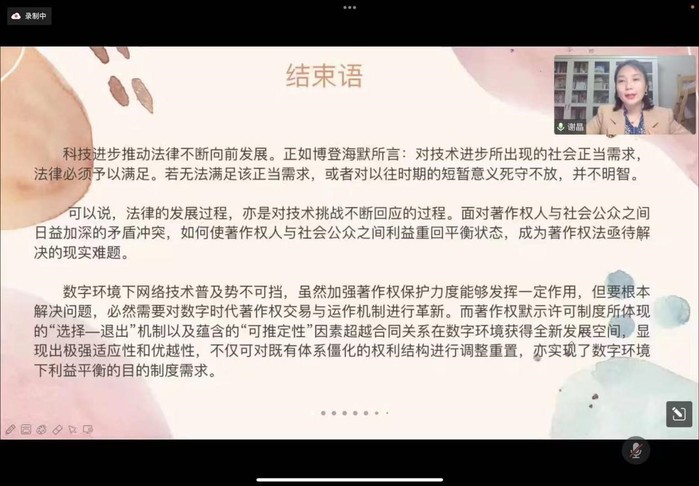 报告结束后,与谈人李玉璧教授对谢晶老师本次报告选题和内容给予了肯定,并基于我国目前在著作权默示许可制度方面的欠缺,提出如何从全局性、整体性以及理论研究等层面对著作权默示许可制度进行构建的相关思考。之后,谢晶老师和同学们就如何结合数字时代进行学术研究等问题进行讨论。最后,吴迪老师对整场会议进行了总结和点评。