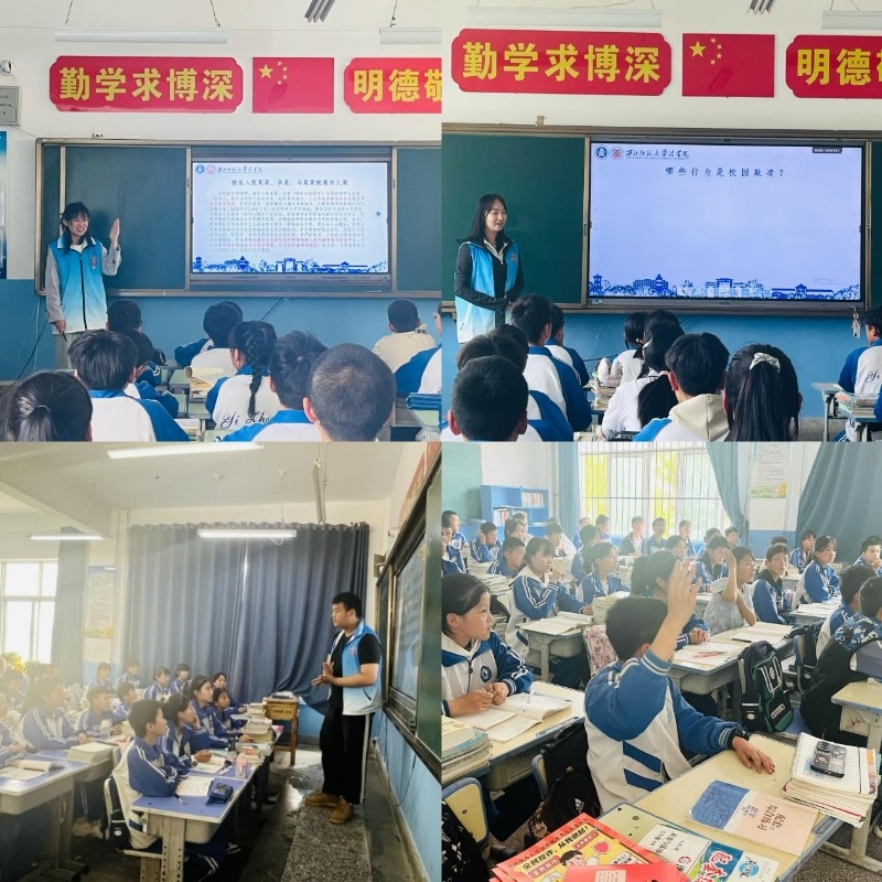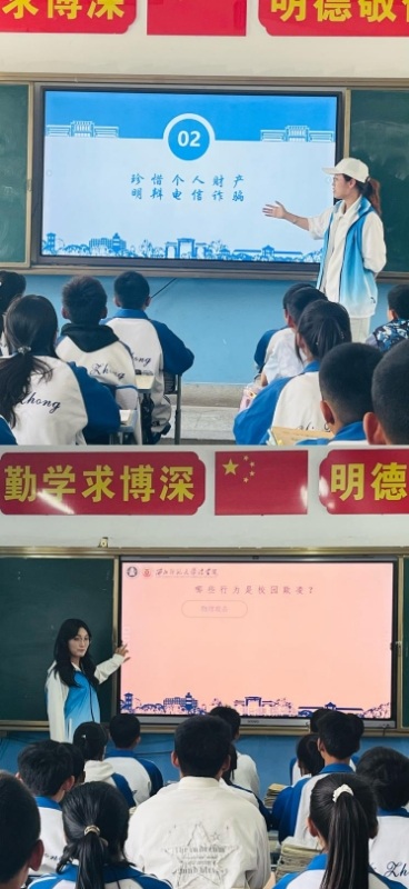 普法课堂宣讲通过两部分内容展开:一是关于校园欺凌问题,志愿者向中员工深入剖析了校园欺凌的成因、危害以及预防措施,通过真实发生的校园案例,阐释了校园欺凌概念的界定、常见形式以及严重危害,呼吁中员工在面对校园欺凌行为时,既要坚决地拒绝参与,更要及时向老师、家长报告,勇敢地向校园欺凌说不,携手守护校园安全;二是针对常见校园诈骗手段,如网络游戏诈骗、虚假中奖信息诈骗、冒充熟人诈骗等,详细剖析了常见的作案手法和套路,通过播放防诈骗宣传短片,引导中员工学习如何识别诈骗陷阱,提高警惕性,并讲授实用的防范技巧,切实提升同学们的防诈免疫力,筑牢财产安全防火墙。